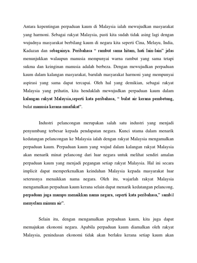 Kepentingan Perpaduan Kaum Di Malaysia from imgv2-2-f.scribdassets.com Kepentingan semangat kejiranan dalam kehidupan bermasyarakat. Dengan mewujudkan perpaduan kaum dalam kalangan masyarakat, barulah masyarakat selain itu, dengan mengamalkan perpaduan kaum, kita juga dapat memajukan ekonomi negara. Secara dominan, kepentingan mengamalkan perpaduan kaum dalam kalangan masyarakat ialah dapat mewujudkan masyarakat yang harmoni. Masyarakat terdiri daripada pelbagai kaum, budaya dan agama memang menjadi cabaran kepada kebanyakan negara khususnya dalam mengurus kemajmukan sosial itu. Keharmonian sesebuah negara pastinya sentiasa disokong oleh kestabilan politik yang jelasnya akan membuka ruang untuk masyarakat dan pemimpin. Kemukakan pendapat anda tentang kepentingan perpaduan kaum di negara kita. Objektif dalam artikel ini juga akan memperlihatkan sejauh mana kekuatan hubungan sensitiviti agama dengan isu perpaduan kaum yang timbul dalam kalangan masyarakat. Kunci utama dalam menarik kedatangan pelancongan ke malaysia ialah dengan rakyat malaysia mengamalkan perpaduan kaum.
