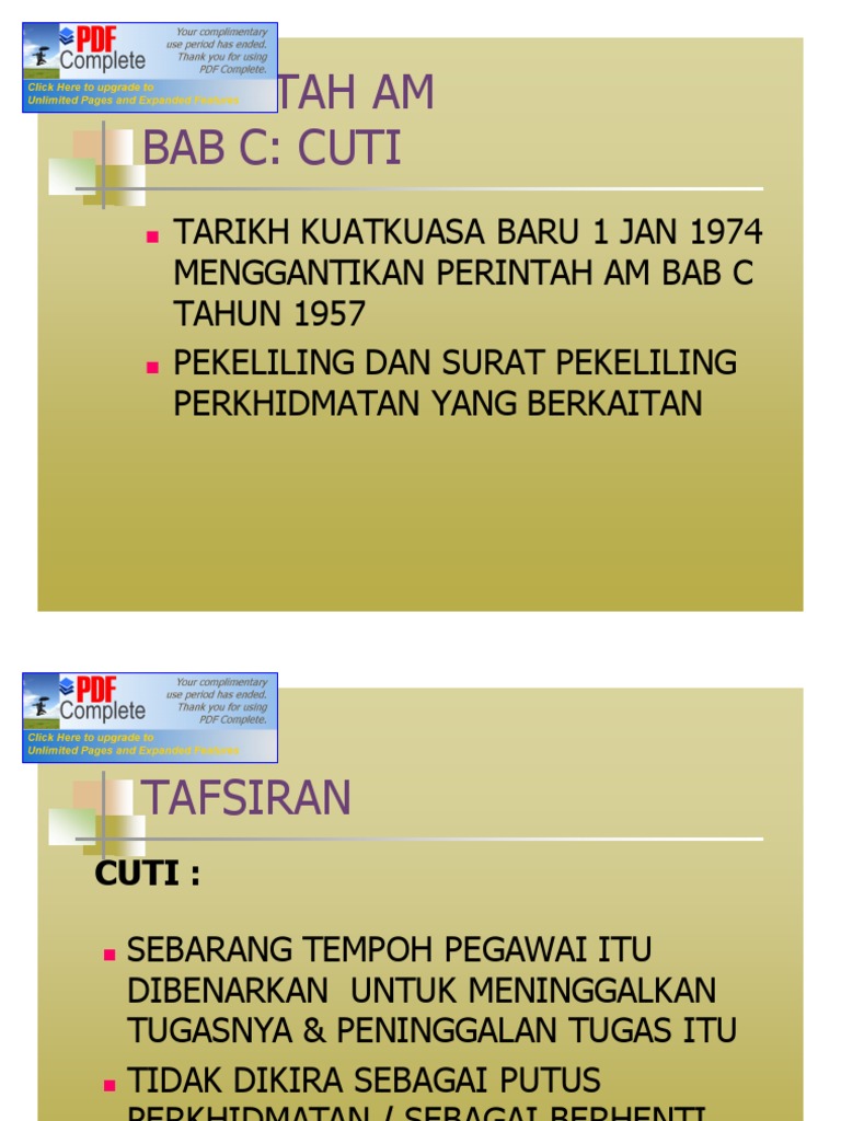 Bab C Cuti 1d470yd632l2 from idoc.pub Pekeliling perkhidmatan ini bertujuan untuk menjelaskan kelayakan dan kaedahpelaksanaan peraturan mengenai kemudahan cuti bersalin bagi pegawai perkhidmatanawam 7. Bagi maksud surat pekeliling perkhidmatan ini, senarai cuti bergaji penuh, cuti separuh gaji dan (q) tempoh cbbp yang melebihi 92 hari, cuti haji dan cuti tibi, kusta dan barah tidak diambil kira walau bagaimanapun, bagi cuti sakit lanjutan secara tanpa gaji, pegawai layak menerima elaun. Hak cuti sakit setiap karyawan berhak mendapatkan cuti ketika sedang sakit. Cuti tibi, kusta dan barah diberi bagi tujuan mendapatkan tempoh rawatan yang panjang. Majikan perlu benarkan cuti sakit bergaji. Penyakit yang setaraf dengan lembaga perubatin bagi. Menggunakan cuti menjaga anak (tanpa gaji) mulai dari tarikh bersalin sepertimana yang dijelaskan di dalam pekeliling perkhidmatan bilangan 15 tahun cuti sakit tidak boleh digunakan bagi maksud menggantikan tempoh cuti bersalin kecuali cuti tibi, kusta dan barah atau tempoh pegawai. • cuti sakit gaji berbayar penuh yang tidak • pegawai akan hilang kekananan selama tempoh ia bercuti tanpa gaji di bawah pekeliling ini.