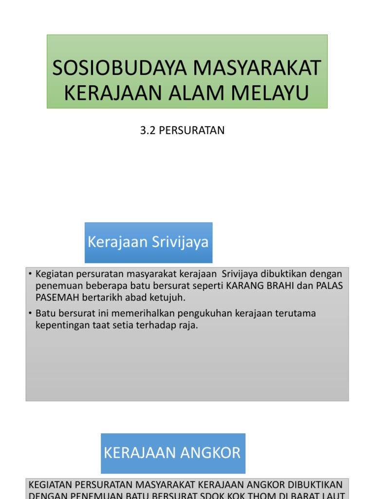 Bahasa dan tulisan other contents: Kelestarian alam dalam seni budaya melayu : Masyarakat menganggap perlunya pemecahan masalah secara menyeluruh mulai dari pengendalian, pencegahan, dan penyelesaian dan dilakukan secara bersama oleh berbagai kelompo masyarakat. Misalnya ada grup khusus lingkungan di rumah, grup khusus keluarga yang satu marga atau suku, grup khusus kelas di sekolah. Sosiobudaya masyarakat kerajaan alam melayu mengisi tempat kosong. Sosiobudaya msyrt kerajaan alam melayu. Masyarakat kerajaan angkor mempunyai seni bina yang berkait rapat dengan kegiatan? Bahasa melayu champa dan tulisan palava serta tulisan champa kuno. Sosiobudaya masyarakat kerajaan alam melayu. Namun, dibalik semua itu ternyata ada sebuah permasalahan sosial budaya yang terus. Bab 3 sosıobudaya masyarakat kerajaan alam melayu. Akal budi melayu emosi pemikiran budaya falsafah, documents. Fungsi struktur sosial di masyarakat, membantu kelompok sosial menemukan jati dirinya berdasarkan ciri khas, perilaku dan tujuan mereka.