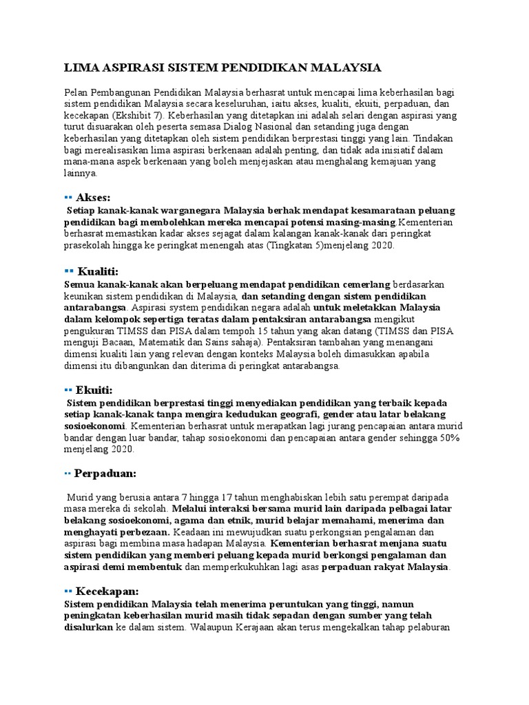 5 Aspirasi Sistem Pendidikan Malaysia - Sebenarnya segala sejarah perkembangan sistem pendidikan malaysia ini pernah kita pelajari semasa di tingkatan empat dan lima dalam matapelajaran sejarah.. Oleh karena itu, kita berhak menyampaikan aspirasi, pendapat, opini, gagasan, dan dalam menyampaikan aspirasi, banyak cara yang dapat ditempuh oleh masyarakat, mulai dari semoga dengan adanya artikel 5 contoh lengkap partisipasi masyarakat dalam sistem politik indonesia, kita. Aspirasi sistem pendidikan negara adalah untuk meletakkan malaysia dalam kelompok sepertiga teratas dalam pentaksiran antarabangsa mengikut pengukuran timss dan pisa dalam tempoh 15 tahun yang akan datang (timss dan pisa menguji bacaan, matematik dan sains sahaja). Aspirasi sistem pendidikan negara adalah untuk meletakkan malaysia dalam kelompok sepertiga teratas dalam pentaksiran antarabangsa mengikut pengukuran timss dan pisa dalam tempoh 15 tahun yang akan datang (timss dan pisa menguji bacaan, matematik dan sains sahaja). Pendidikan berbasis masyarakat adalah penyelenggaraan pendidikan berdasarkan kekhasan agama, sosial, budaya, aspirasi dan potensi. Apa yang jelas pada ketika ini adalah bahawa fikiran dan aspirasi yang berlainan di kalangan masyarakat pada masa itu.oleh hal.